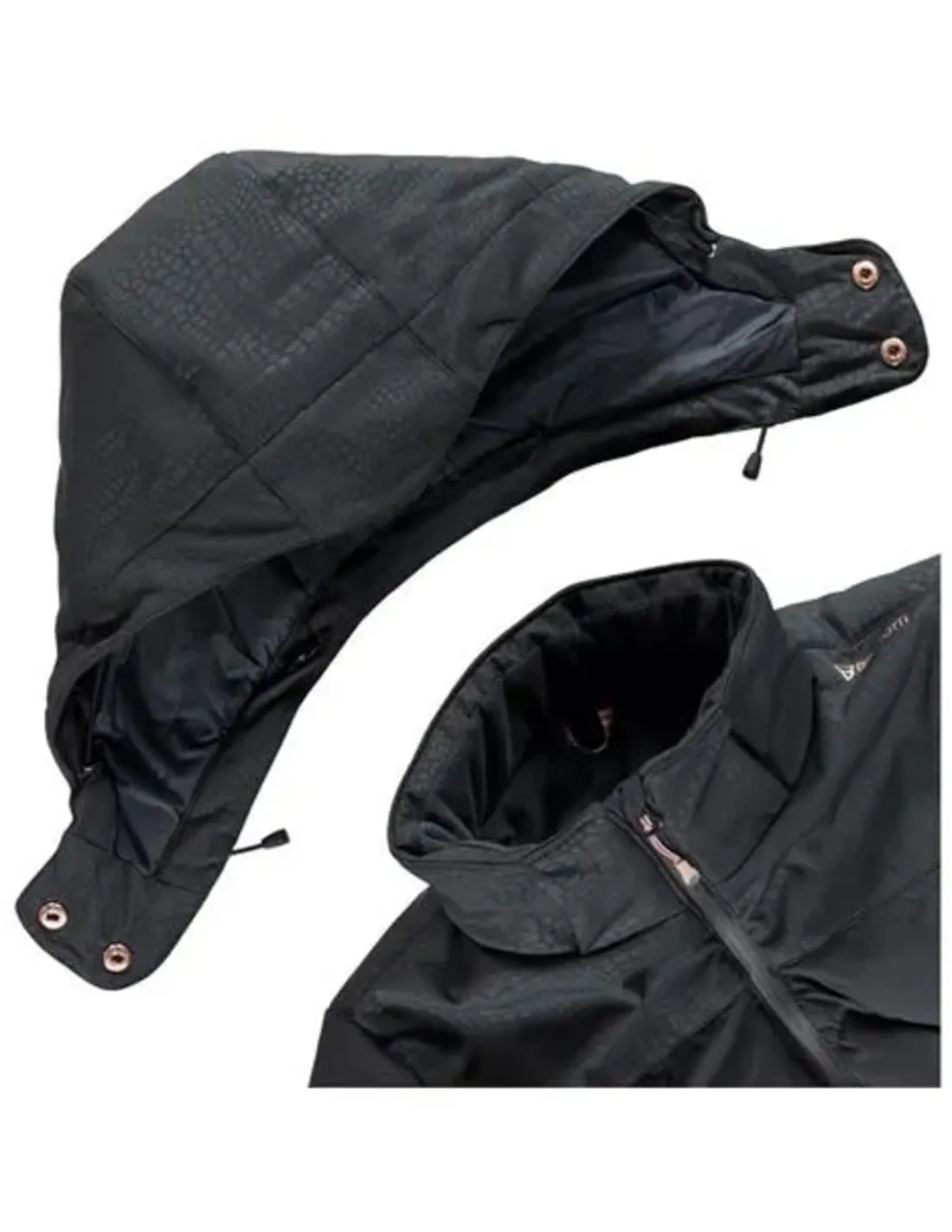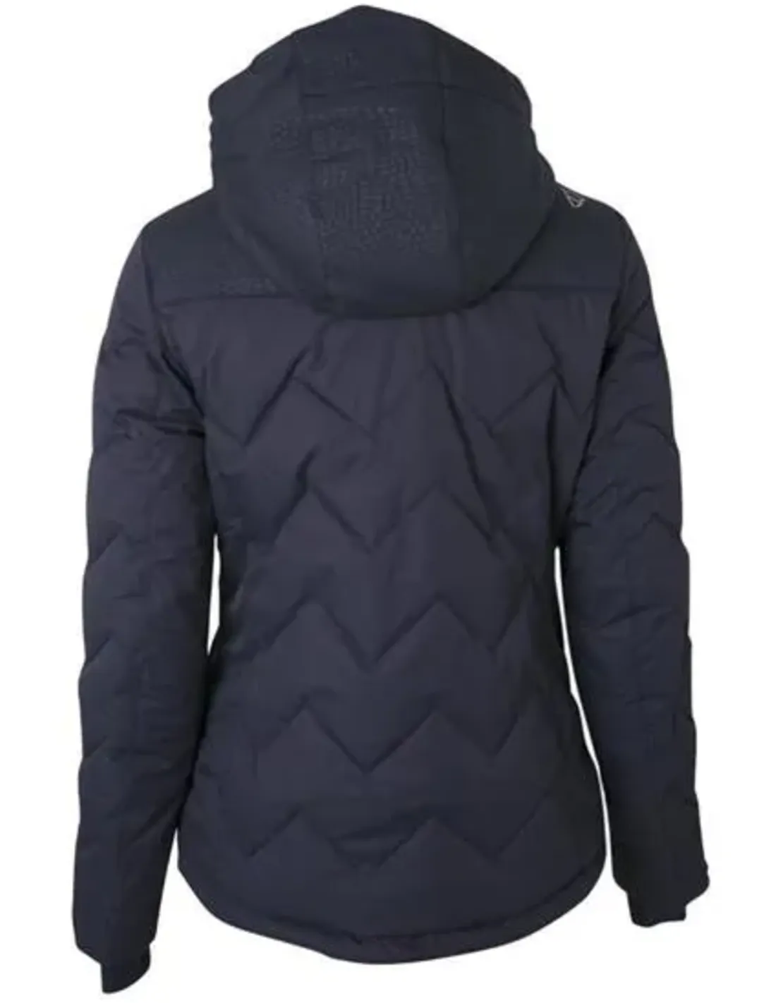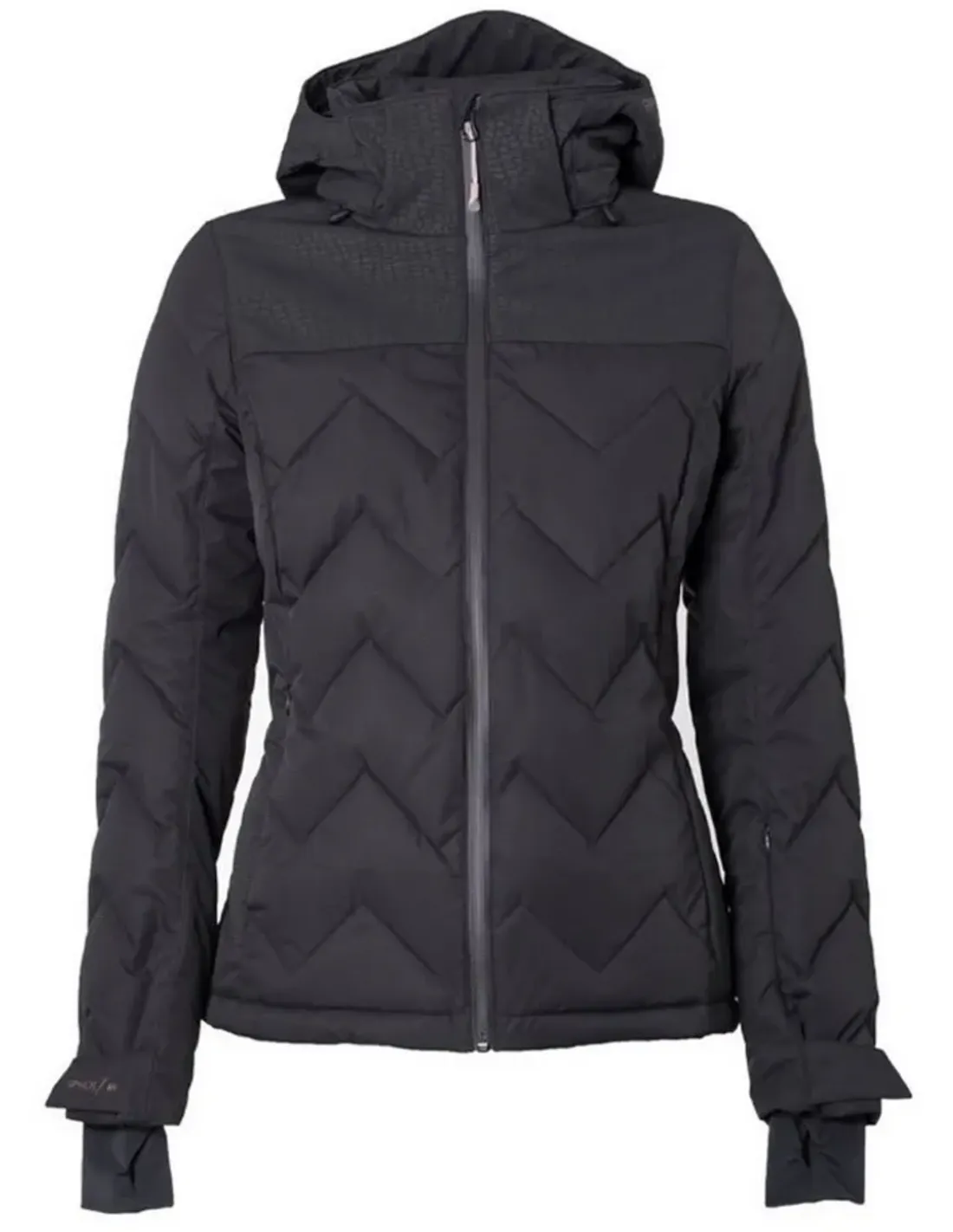 De jas heeft een normale pasvorm met een doorlopende ritssluiting met kinbeschermer en een opstaande kraag met afneembare capuchon. De ski jas heeft een speciale zak voor je telefoon en een opening voor de koptelefoon. De voorgevormde mouwen zijn voorzien van lycra polsmanchetten voor een aansluitende pasvorm. En op de linkermouw zit een ritsvak voor de skipas.