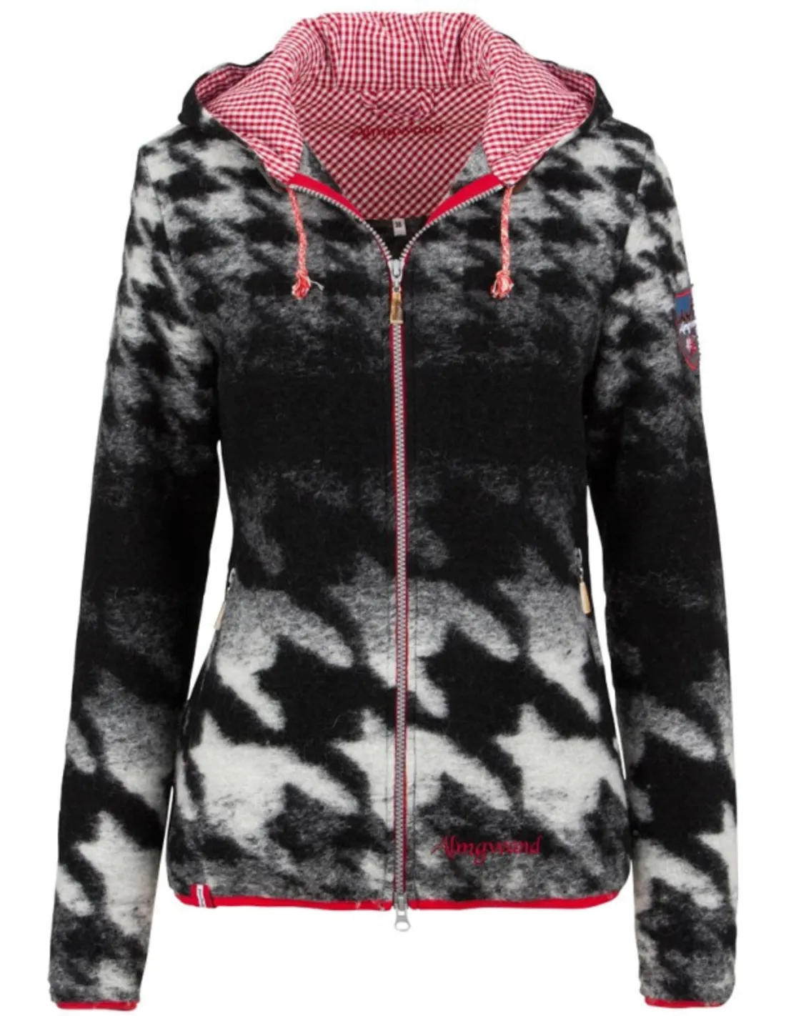 De Walkersdorf-5 van het merk Almgwand is een comfortabel vestjasje met capuchon. Dit hippe model met een zwart witte print heeft een cappuchon met aan de binnenzijde een leuke rood wit geruite voering. De walkersdorf heeft een polyamide lining en twee steekzakken met rits. De mouwen en onderrand zijn afgewerkt met een elastische band in de contrasterende kleur rood. 80 Wool, 20 Polyester