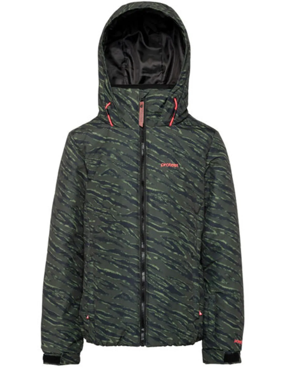 De Twister JR is voorzien van 10K waterbestendigheid en 10g ademend vermogen, waardoor je warm en droog blijft.D eze jas iheeft met een all over print. De stof is gewatteerd om extra warmte toe te voegen. Deze ski-jas/snowboardjas heeft een regular fit en een normale lengte. De capuchon zit vast aan de jas en de zakken zijn voorzien van een ritssluiting.
