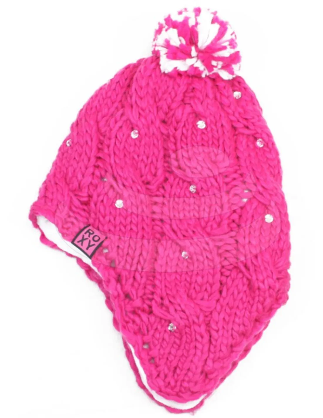 Grey skies are gonna clear up, put on a happy face. This chunky knit beanie will help get you going with a pom and warm polar fleece lining. And for a little extra sparkle, the earflaps feature gem details. Roxy logo flag label appears at side. 9-inch fit. 100 acrylic. Imported. Machine washable.